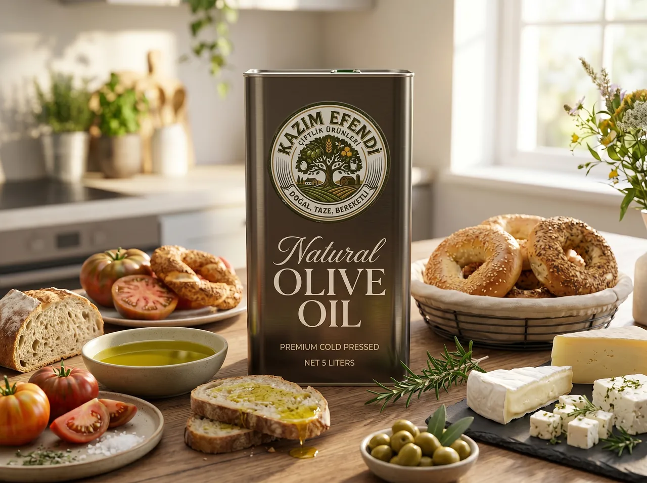 Kazım Efendi 5 litre zeytinyağı tenekesini sofrada gösteren tanıtım görseli